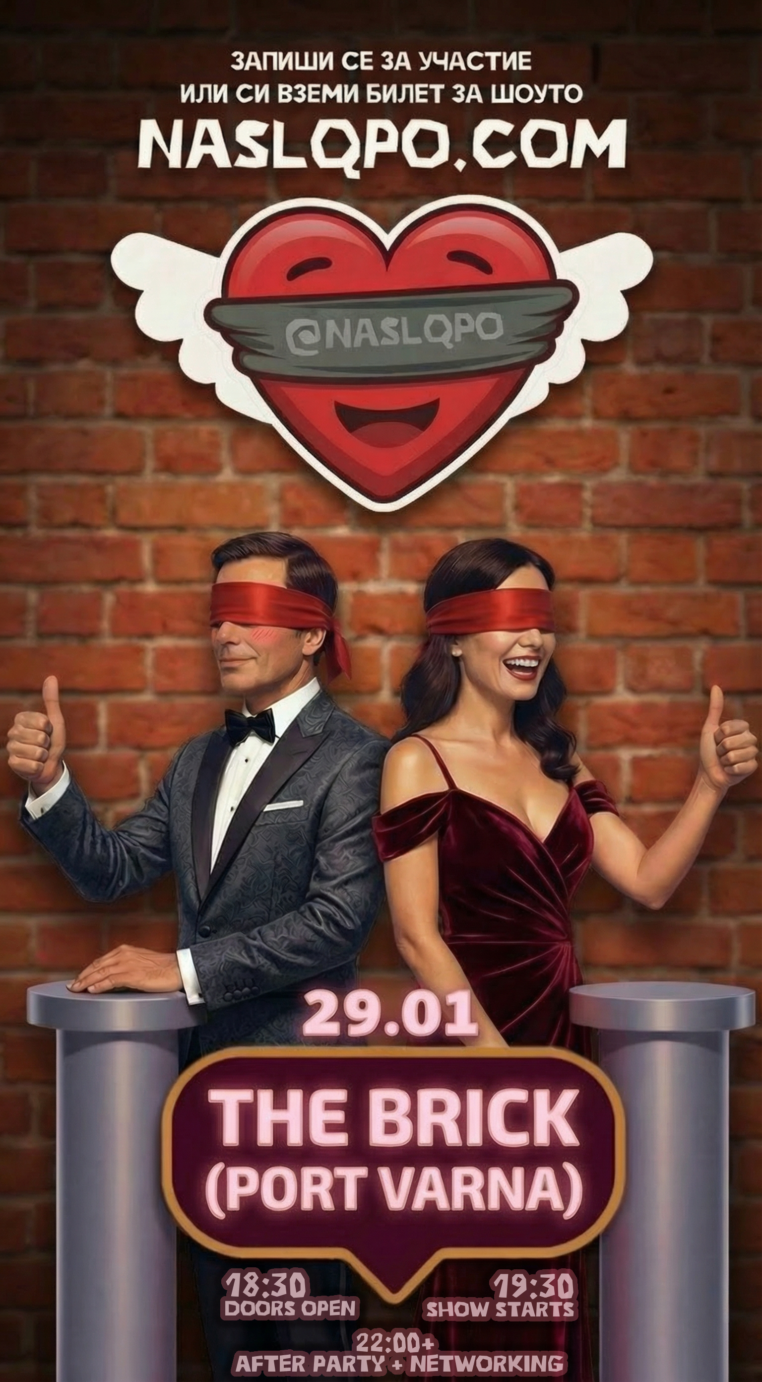 Участници със завързани очи отговарят на провокативни въпроси (включително анонимни от публиката), играят с импровизации и се опитват да преценят дали отсреща има потенциал за нещо повече. Публиката.. гледа и се смее!